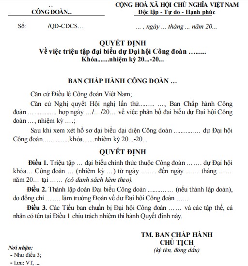 1. Quyết định triệu tập đại biểu dự Đại hội Công đoàn