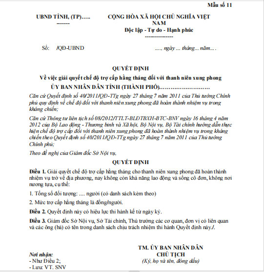 Mẫu quyết định về việc giải quyết chế độ trợ cấp hằng tháng đối với thanh niên xung phong