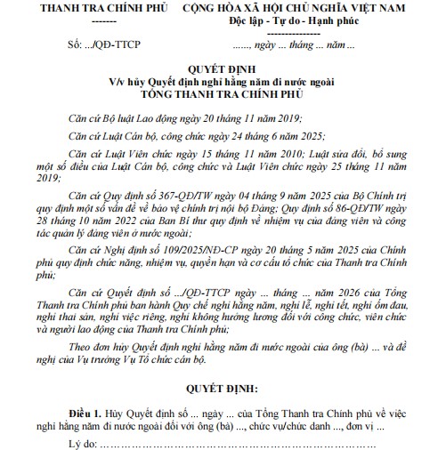 Điều 1. Hủy Quyết định số ... ngày ... của Tổng Thanh tra Chính phủ về việc nghỉ hằng năm đi nước ngoài đối với ông (bà) ..., chức vụ/chức danh ..., đơn vị ...