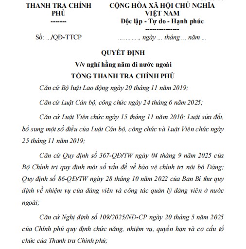 Căn cứ Quyết định số .../QĐ-TTCP ngày ... tháng ... năm 2026 của Tổng Thanh tra Chính phủ ban hành Quy chế nghỉ hằng năm, nghỉ lễ, nghỉ tết, nghỉ ốm đau, nghỉ thai sản, nghỉ việc riêng, nghỉ không hưởng lương đối với công chức, viên chức và người lao động của Thanh tra Chính phủ;