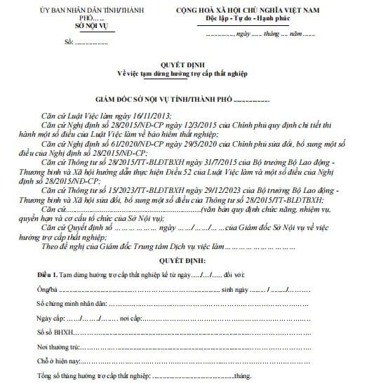Mẫu quyết định về việc tạm dừng hưởng trợ cấp thất nghiệp