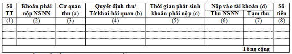 (a) Cơ quan quản lý thu nơi người nộp thuế còn nợ thuế; (b) Quyết định hành chính của cơ quan có thẩm quyền hoặc tờ khai hải quan; (c) Kỳ thuế, từ kỳ đến kỳ; (d) Đối với khoản phải nộp NSNN theo tờ khai, quyết định của cơ quan thu thì đánh dấu dấu “V” vào cột tài khoản “Thu NSNN”, đối với khoản thuế xuất nhập khẩu do cơ quan hải quan quản lý thì đánh dấu dấu “V” vào cột tài khoản “Tạm thu”, đồng thời ghi số tiền tương ứng theo dòng tại cột (8) “Số tiền”.