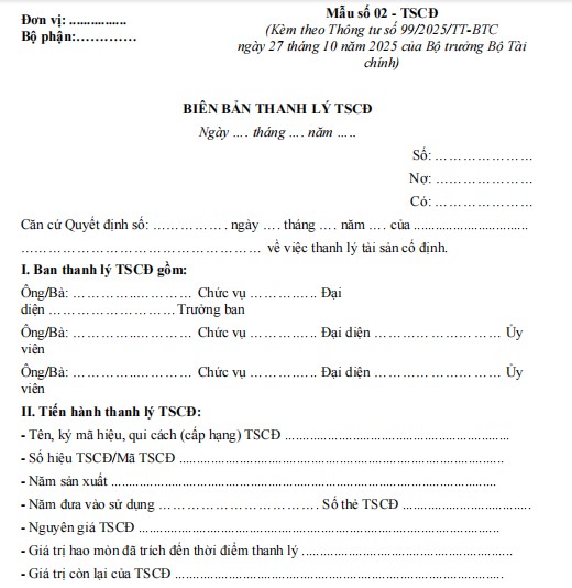 Biên bản thanh lý tài sản cố định là văn bản do doanh nghiệp lập để thanh lý tài sản cố định của đơn vị. Trong biên bản nêu rõ được nguyên giá tài sản cố định, hao mòn tài sản cố định và giá trị còn lại của tài sản cố định... hoatieu.vn xin được giới thiệu đến các bạn mẫu biên bản thanh lý tài sản cố định này được ban hành kèm theo Thông tư 99/2025/TT-BTC.
