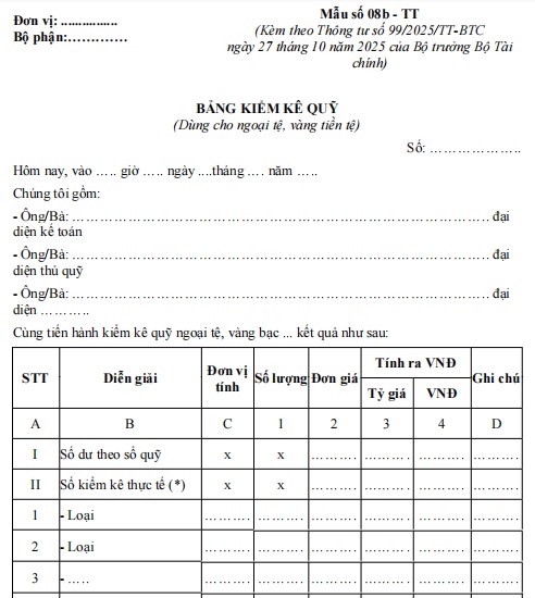 Mẫu số 08b-TT: Bảng kiểm kê quỹ (dùng cho ngoại tệ, vàng tiền tệ) ban hành kèm theo Thông tư 99/2025/TT-BTC là chứng từ kế toán quan trọng, được sử dụng để kiểm kê, đối chiếu số tồn quỹ thực tế đối với các loại ngoại tệ và vàng tiền tệ tại cơ quan, đơn vị. Biểu mẫu này giúp ghi nhận đầy đủ số lượng, chủng loại, mệnh giá, tỷ giá quy đổi (nếu có) và giá trị tương ứng theo sổ kế toán tại thời điểm kiểm kê.