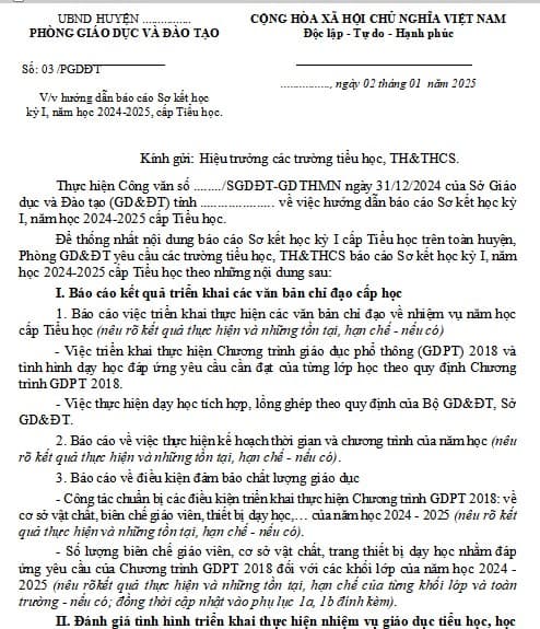 - 1822 từ; - Phụ lục hướng dẫn chi tiết cách viết báo cáo sơ kết học kì 1 do Sở Giáo dục địa phương gửi đến các trường tiểu học trên địa bàn. |