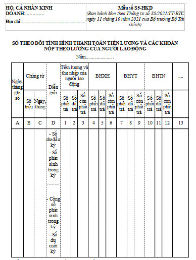 Mẫu số S5-HKD: Sổ theo dõi tình hình thanh toán tiền lương và các khoản nộp theo lương của người lao động