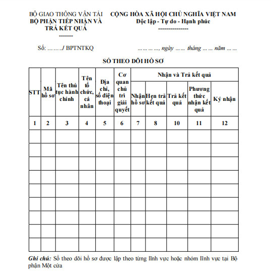 Ghi chú: Sổ theo dõi hồ sơ được lập theo từng lĩnh vực hoặc nhóm lĩnh vực tại Bộ phận Một cửa