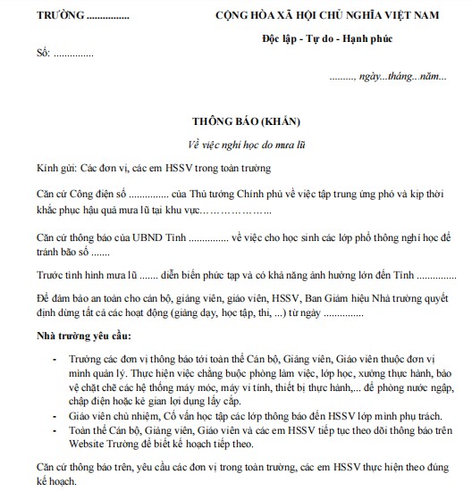 Mẫu thông báo cho học sinh nghỉ học do mưa lũ