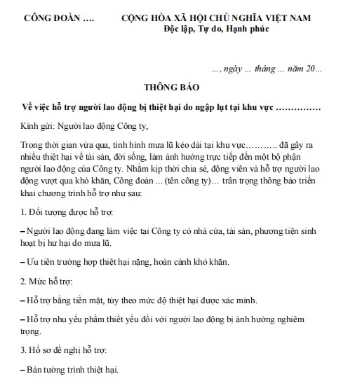 Trong thời gian vừa qua, tình hình mưa lũ kéo dài tại khu vực……….. đã gây ra nhiều thiệt hại về tài sản, đời sống, làm ảnh hưởng trực tiếp đến một bộ phận người lao động của Công ty. Nhằm kịp thời chia sẻ, động viên và hỗ trợ người lao động vượt qua khó khăn, Công đoàn …(tên công ty)… trân trọng thông báo triển khai chương trình hỗ trợ như sau:
