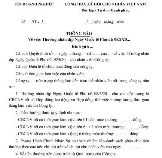 2. Nội dung mẫu Thông báo thưởng nhân dịp 8/3