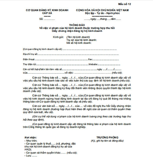 Mẫu thông báo về việc vi phạm của hộ kinh doanh thuộc trường hợp bị thu hồi Giấy chứng nhận đăng ký hộ kinh doanh là văn bản quan trọng, được cơ quan đăng ký kinh doanh ban hành nhằm thông báo chính thức cho hộ kinh doanh biết về các hành vi vi phạm, lý do và căn cứ pháp lý dẫn đến việc thu hồi giấy chứng nhận.