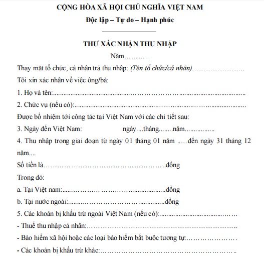 2. Biểu mẫu thư xác nhận thu nhập cá nhân