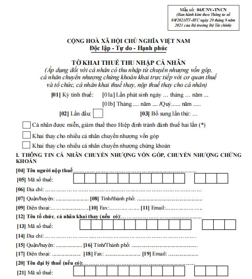 (Áp dụng đối với cá nhân có thu nhập từ chuyển nhượng vốn góp,