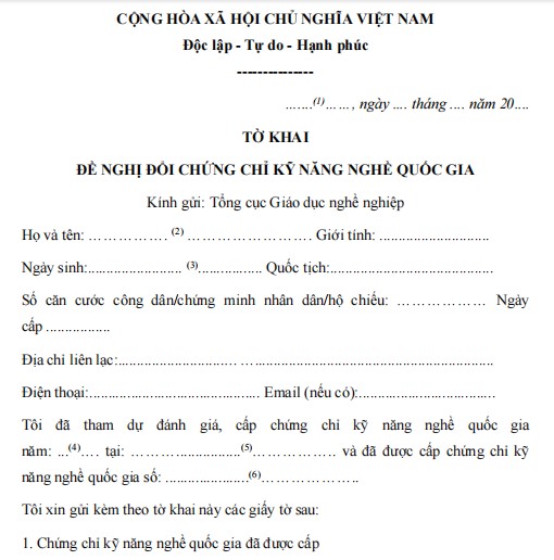 1. Tờ khai đề nghị đổi chứng chỉ kỹ năng nghề quốc gia