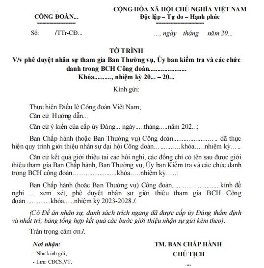 Ban Chấp hành (hoặc Ban Thường vụ) Công đoàn......…… .............kính đề nghị ... xem xét, phê duyệt nhân sự giới thiệu tham gia BCH Công đoàn ..............khóa......nhiệm kỳ 2023-2028./.