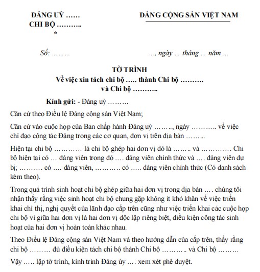 Mẫu tờ trình xin tách chi bộ