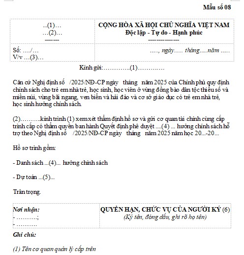(2)……….kính trình (1) xem xét thẩm định hồ sơ và gửi cơ quan tài chính cùng cấp trình cấp có thẩm quyền ban hành Quyết định phê duyệt ....(4) ... hưởng chính sách hỗ trợ theo Nghị định số .../2025/NĐ-CP ngày tháng năm 2025 năm học 20...-20...