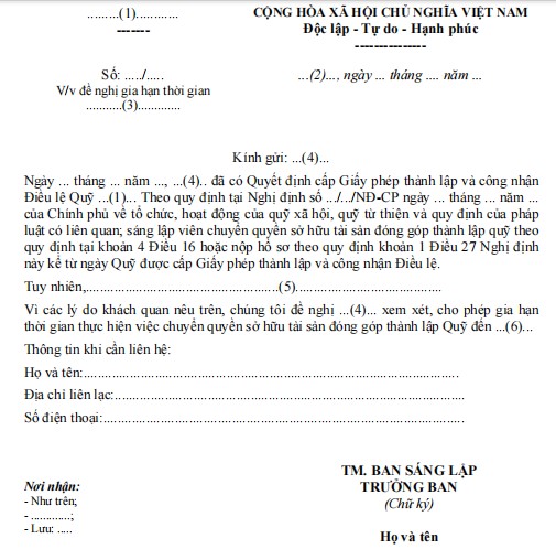 1. Văn bản đề nghị gia hạn thời gian chuyển quyền sở hữu tài sản đóng góp thành lập quỹ