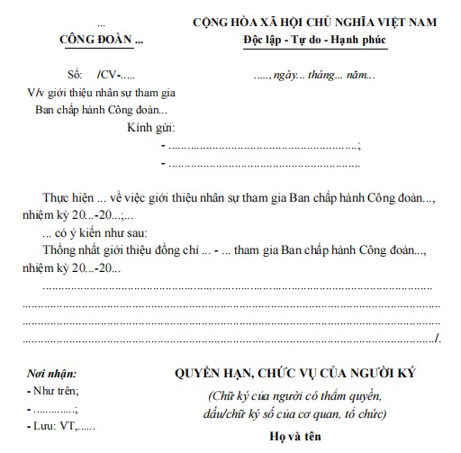 Thực hiện ... về việc giới thiệu nhân sự tham gia Ban chấp hành Công đoàn..., nhiệm kỳ 20...-20...;...
