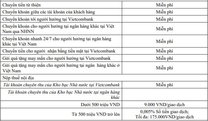 Biểu phí chuyển khoản ngân hàng của VietcomBank