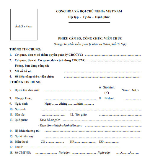 Mẫu phiếu cán bộ, công chức, viên chức là một tài liệu hành chính thiết yếu, được thiết kế chuyên biệt để thu thập và quản lý thông tin nhân sự trong hệ thống phần mềm quản lý của Thành phố Hà Nội. Mẫu phiếu này đóng vai trò quan trọng trong việc chuẩn hóa dữ liệu, đảm bảo tính thống nhất và chính xác của thông tin cá nhân, quá trình công tác, năng lực chuyên môn, cũng như các dữ liệu liên quan khác của cán bộ, công chức, viên chức.