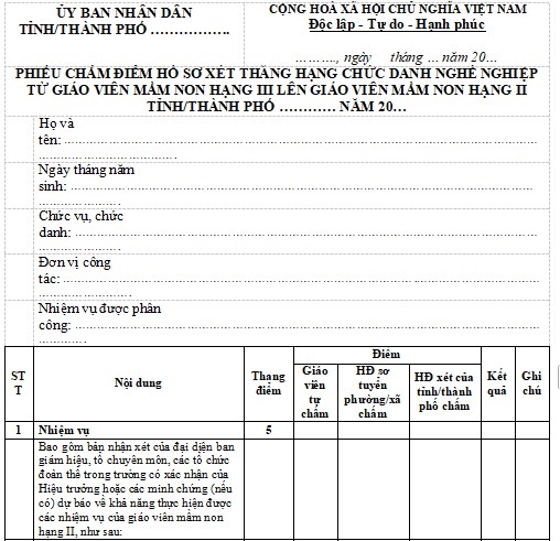 - 1. Phiếu chấm điểm hồ sơ xét thăng hạng chức danh nghề nghiệp giáo viên mầm non hạng III lên hạng II