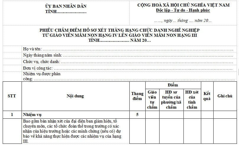 - 1. Phiếu chấm điểm hồ sơ xét thăng hạng chức danh nghề nghiệp giáo viên mầm non hạng IV lên hạng III