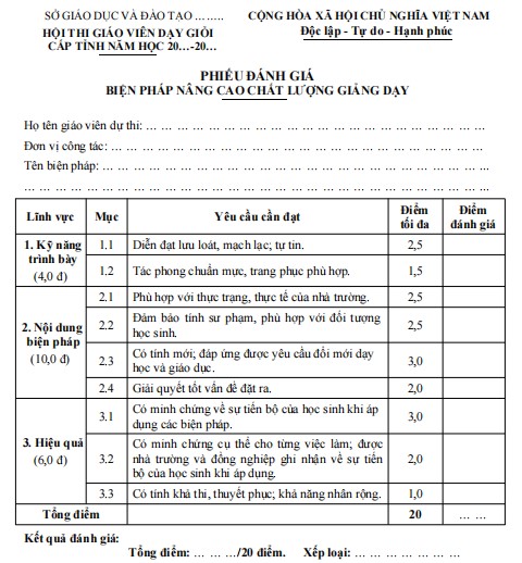 Phiếu chấm thi giáo viên dạy giỏi cấp tỉnh