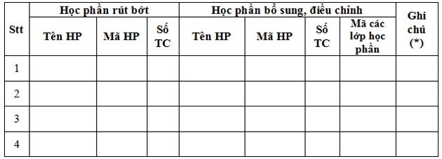 - Nếu rút bớt học phần đã đăng ký ghi "rút bớt"
