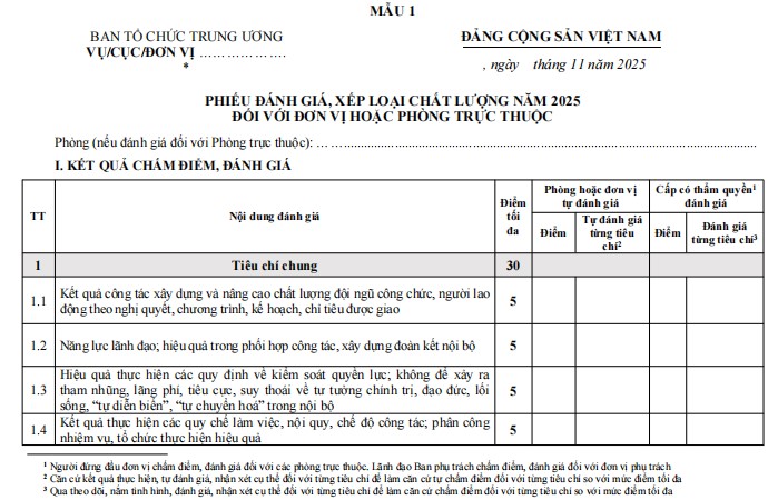 Phiếu đánh giá, xếp loại chất lượng năm 2025 đối với đơn vị hoặc phòng trực thuộc được ban hành kèm theo Hướng dẫn số 44-HD/BTCTW của Ban Tổ chức Trung ương, là căn cứ quan trọng để các cơ quan, tổ chức, đơn vị thực hiện công tác kiểm điểm và đánh giá tập thể cuối năm. Mẫu phiếu này quy định rõ các tiêu chí, nội dung và mức xếp loại, giúp bảo đảm việc đánh giá được tiến hành khách quan, minh bạch, phản ánh đúng kết quả thực hiện nhiệm vụ chính trị, công tác xây dựng Đảng và tinh thần đoàn kết nội bộ. Việc sử dụng mẫu phiếu chuẩn theo hướng dẫn góp phần nâng cao chất lượng đánh giá, làm cơ sở cho việc xếp loại và khen thưởng hằng năm.