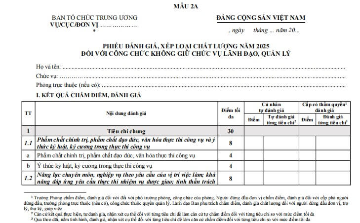 Phiếu đánh giá, xếp loại chất lượng năm 2025 đối với công chức không giữ chức vụ lãnh đạo, quản lý là công cụ quan trọng được ban hành kèm theo Hướng dẫn 44-HD/BTCTW nhằm chuẩn hóa quy trình đánh giá năng lực và hiệu quả công tác của công chức. Việc áp dụng phiếu đánh giá này góp phần đảm bảo sự khách quan, minh bạch, tạo điều kiện thuận lợi để đánh giá toàn diện phẩm chất, chuyên môn và thái độ làm việc. Đây là căn cứ thiết yếu giúp các cơ quan, đơn vị nâng cao chất lượng đội ngũ công chức, từ đó thúc đẩy hiệu quả hoạt động quản lý nhà nước, đảm bảo sự phát triển bền vững và ổn định của tổ chức.
