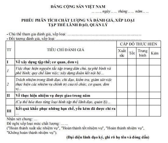 Mẫu Phiếu phân tích chất lượng và đánh giá, xếp loại tập thể lãnh đạo, quản lý, được thiết kế nhằm đáp ứng nhu cầu kiểm điểm, đánh giá và phân loại chất lượng hàng năm đối với các tổ chức Đảng, đảng viên cũng như các tập thể, cá nhân cán bộ lãnh đạo và quản lý ở các cấp độ khác nhau.