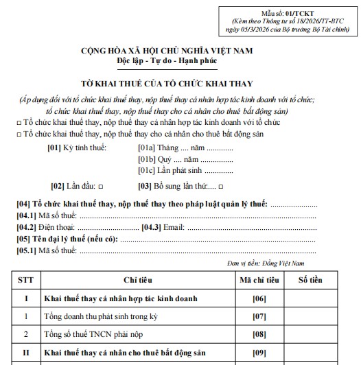 Trong bối cảnh hệ thống pháp luật thuế ngày càng được kiện toàn nhằm minh bạch hóa các hoạt động tài chính, Mẫu số 01/TCKT ban hành kèm theo Thông tư 18/2026/TT-BTC đóng vai trò là công cụ pháp lý quan trọng dành cho các tổ chức thực hiện nghĩa vụ khai thuế thay và nộp thuế thay. Đối với các nhà đầu tư và doanh nghiệp, việc áp dụng biểu mẫu này không chỉ đơn thuần là thực hiện thủ tục hành chính, mà còn là phương thức xác lập trách nhiệm thuế đối với các khoản thu nhập phát sinh từ hoạt động hợp tác kinh doanh hoặc các nguồn thu nhập của cá nhân mà tổ chức có trách nhiệm chi trả.