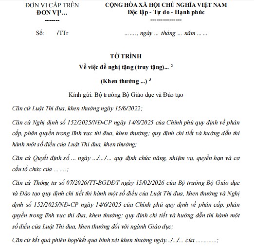 Tờ trình đề nghị khen thưởng theo Mẫu số 01 ban hành kèm theo Thông tư 07/2026/TT-BGDĐT của Bộ Giáo dục và Đào tạo là văn bản hành chính quan trọng, được sử dụng để trình cấp có thẩm quyền xem xét, quyết định việc khen thưởng đối với tập thể, cá nhân có thành tích xuất sắc trong lĩnh vực giáo dục.