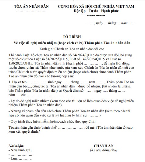 Thi hành Luật Tổ chức Tòa án nhân dân số 34/2024/QH15 đã được sửa đổi, bổ sung một số điều theo Luật số 81/2025/QH15, Luật số 142/2025/QH15 và Luật số 150/2025/QH15, Tòa án nhân dân tỉnh (thành phố) ……………. đề nghị Hội đồng tuyển chọn, giám sát Thẩm phán quốc gia xem xét; Chánh án Tòa án nhân dân tối cao trình Chủ tịch nước quyết định miễn nhiệm (hoặc cách chức) chức danh Thẩm phán Tòa án nhân dân đối với các trường hợp sau: