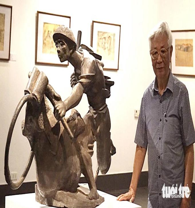 Nhà điêu khắc Lưu Danh Thanh bên bức điêu khăc Cả nước ra trận |