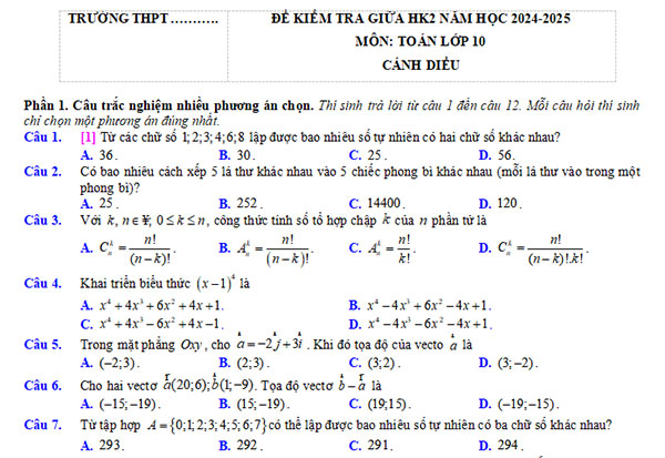 2. Đề thi giữa học kì 2 Toán 10 Cánh Diều