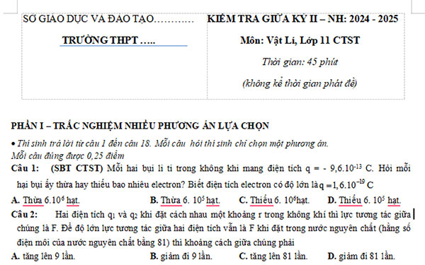 1. Đề kiểm tra giữa kì 2 Vật lí 11 Cánh Diều