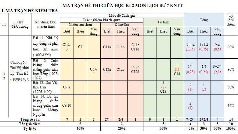 Ma trận đề thi giữa học kì 2 Lịch sử 7
