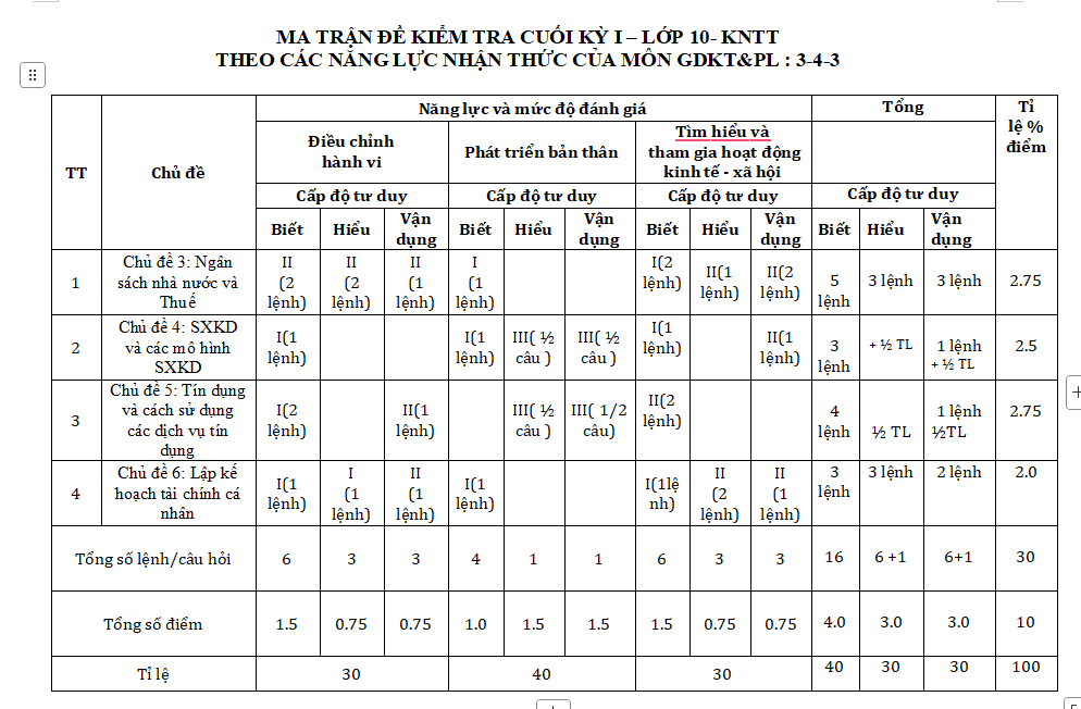 Ma trận đề thi cuối kì 1 Giáo dục Kinh tế và Pháp luật 10
