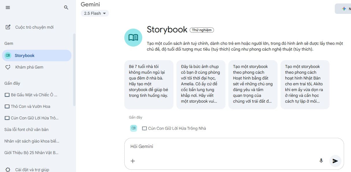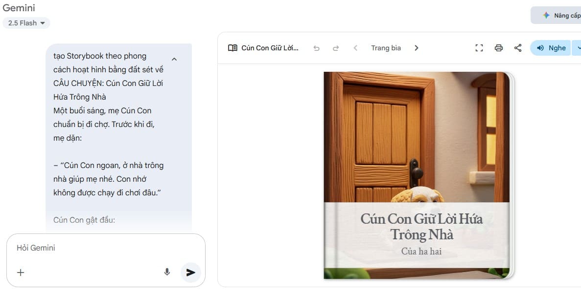 Ví dụ: Tạo Storybook theo phong cách hoạt hình bằng đất sét về [Câu chuyện: Cún con giữ lời hứa trông nhà...] > Phần này bạn coppy câu chuyện đã tạo ở ChatGPT và dán vào. > Chờ để Gemini tạo sách lật