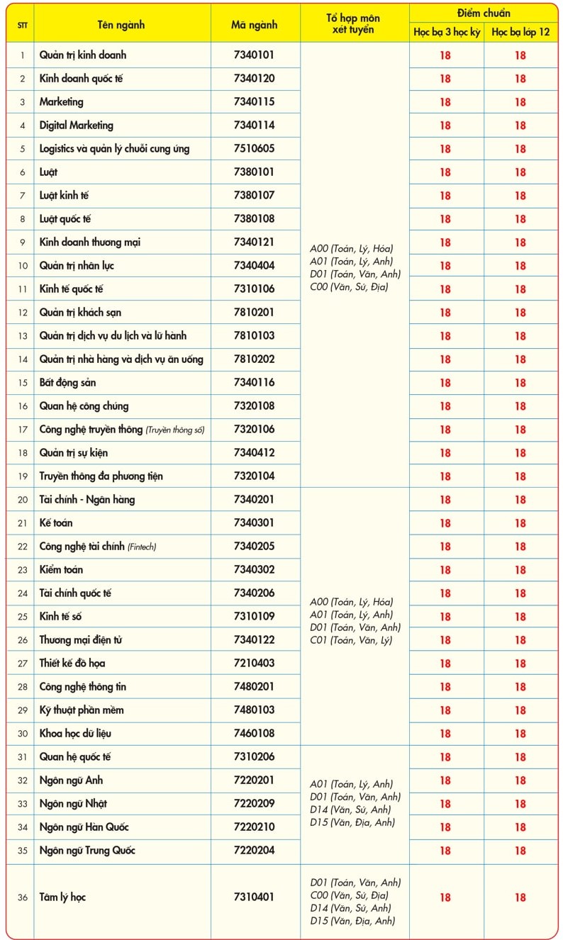 Các ngành Marketing, Quản trị kinh doanh, Quan hệ công chúng, Kinh doanh thương mại, Tài chính - Ngân hàng, Quản trị khách sạn, Thương mại điện tử, Ngôn ngữ Anh, Ngôn ngữ Nhật, Ngôn ngữ Hàn Quốc, Ngôn ngữ Trung Quốc Quản trị nhân lực, Kế toán, Công nghệ thông tin, Quản trị dịch vụ du lịch và lữ hành, Quản trị nhà hàng và dịch vụ ăn uống, Luật, Luật kinh tế, Khoa học dữ liệu, Tài chính quốc tế có mức điểm nhận hồ sơ 17 điểm; các ngành còn lại là 16 điểm.