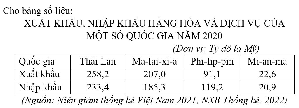 Câu 47. Theo bảng số liệu, nhận xét nào sau đây đúng về tỉ trọng xuất khẩu trong tổng trị giá xuất nhập khẩu hàng hóa và dịch vụ của một số quốc gia năm 2020?
