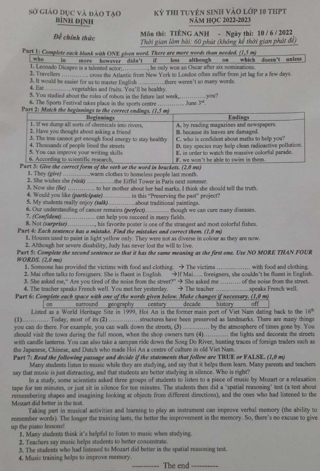 - Đáp án đề thi vào 10 môn Anh tỉnh Bình Định 2022