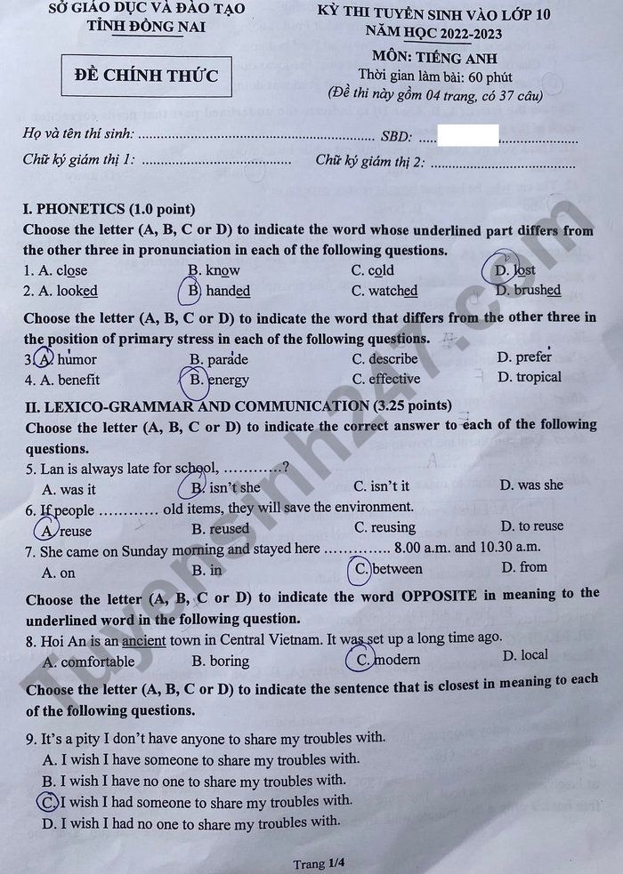 Đáp án đề Anh vào 10 Đồng Nai đang được các thầy cô giải. Các em mở sẵn bài viết chờ 1 lúc rồi nhấn F5 để xem đáp án.