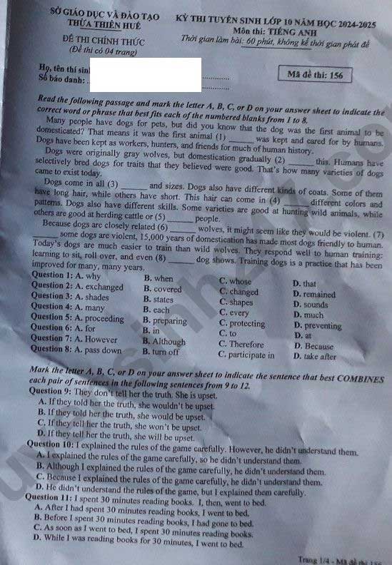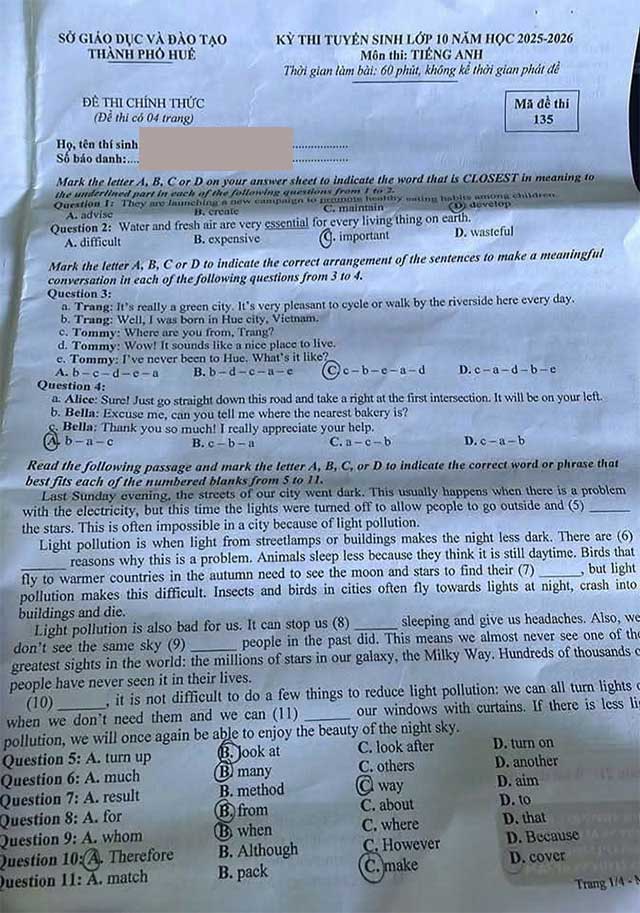 Đáp án đề thi tuyển sinh lớp 10 môn Anh Huế 2025-2026 - Đề thi tuyển sinh lớp 10 môn Tiếng Anh Thừa Thiên Huế năm 2025 được xây dựng nhằm đánh giá toàn diện năng lực ngôn ngữ của học sinh lớp 9, bao gồm các kỹ năng nghe, nói, đọc, viết cùng kiến thức ngữ pháp và từ vựng theo chương trình chuẩn. Đề thi gồm nhiều dạng bài tập phong phú như phát âm, từ vựng – ngữ pháp, đọc hiểu và viết lại câu, giúp kiểm tra khả năng vận dụng tiếng Anh trong các tình huống thực tế và phát triển tư duy ngôn ngữ. Kì thi vào lớp 10 năm học 2025-2026 Thừa Thiên Huế sẽ chính thức được tổ chức vào ngày 2/6/2025. Theo đó, các thí sinh dự thi vào lớp 10 THPT công lập Huế 2025 sẽ làm bài 3 môn thi bắt buộc là Toán, Ngữ văn và tiếng Anh