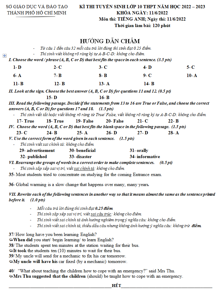 Đáp án đề thi vào lớp 10 2022 Tp HCM môn tiếng Anh chính thức