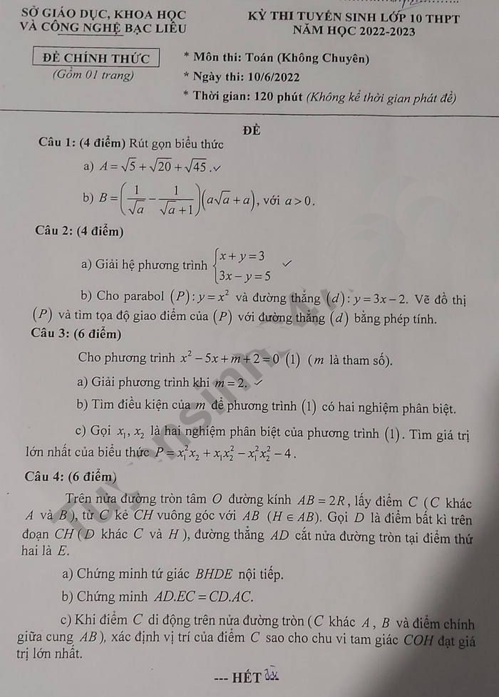 7. Đáp án đề thi vào 10 môn Toán Bạc Liêu 2022