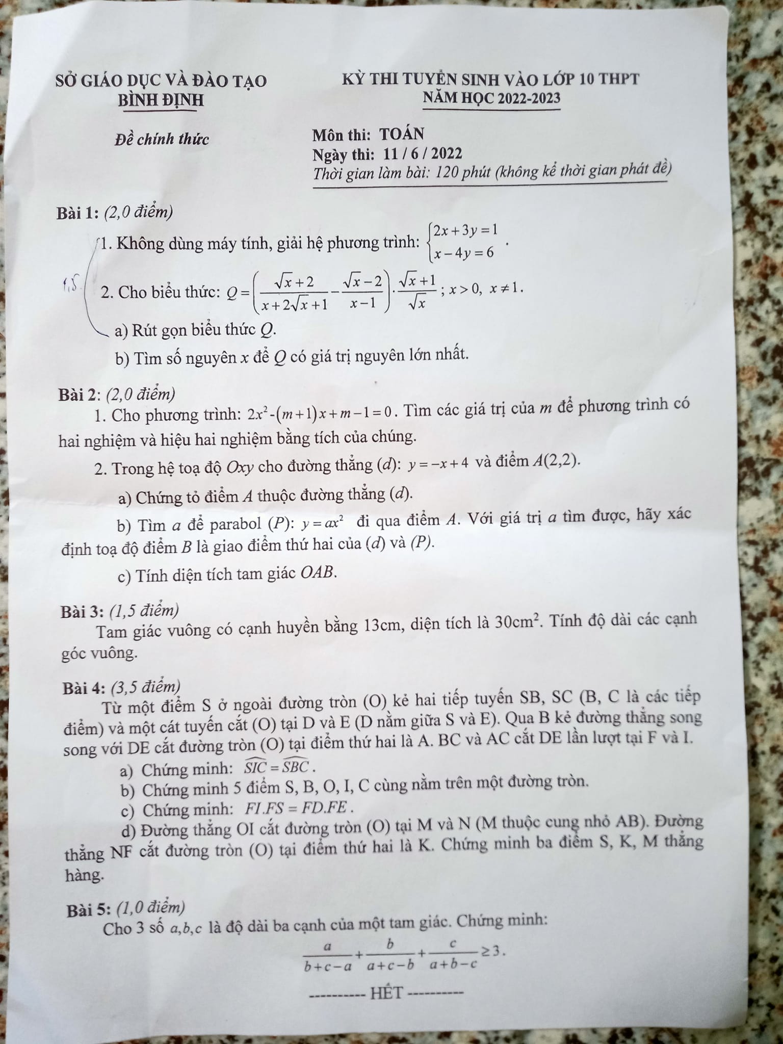 - Đề thi vào lớp 10 năm 2022 môn Toán tỉnh Bình Định