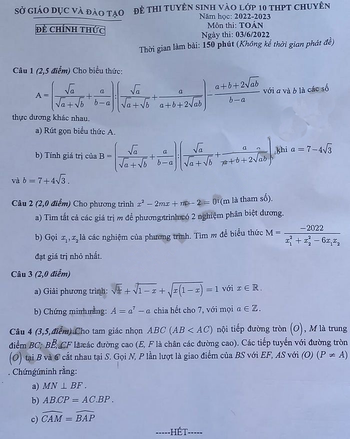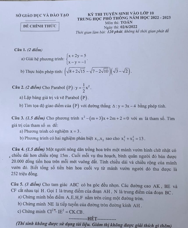 Đề thi vào 10 môn Toán Bình Dương 2022